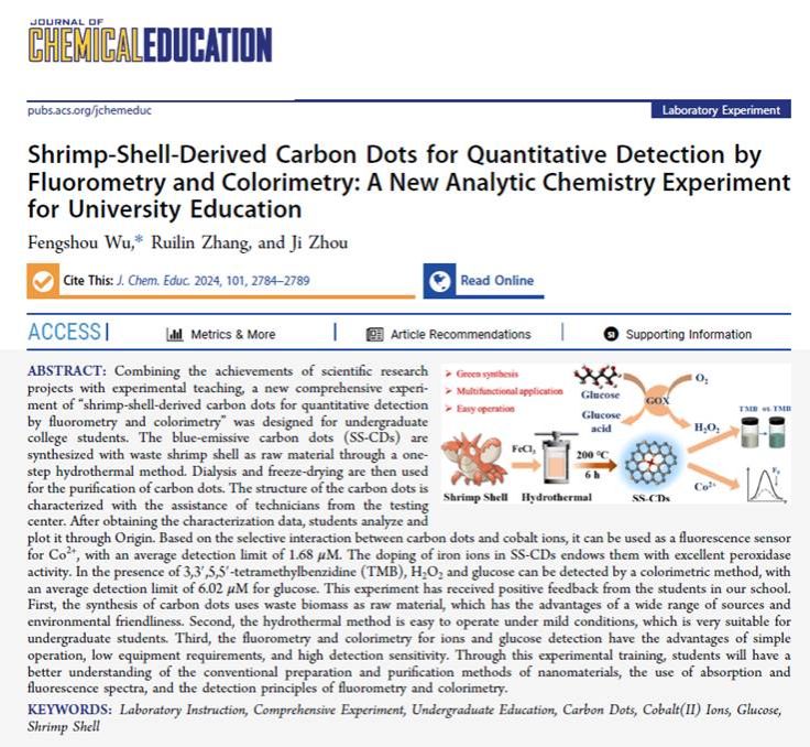 吴风收教授在化学教育国际顶级期刊《Journal of Chemical Education》(JCE)发表最新教研论文“Shrimp Shell-derived Carbon Dots for Quantitative Detection by Fluorometry and Colorimetry: A New Analytic Chemistry Experiment for University Education”。吴风收教授为该论文的第一作者和通讯作者,香蕉视频