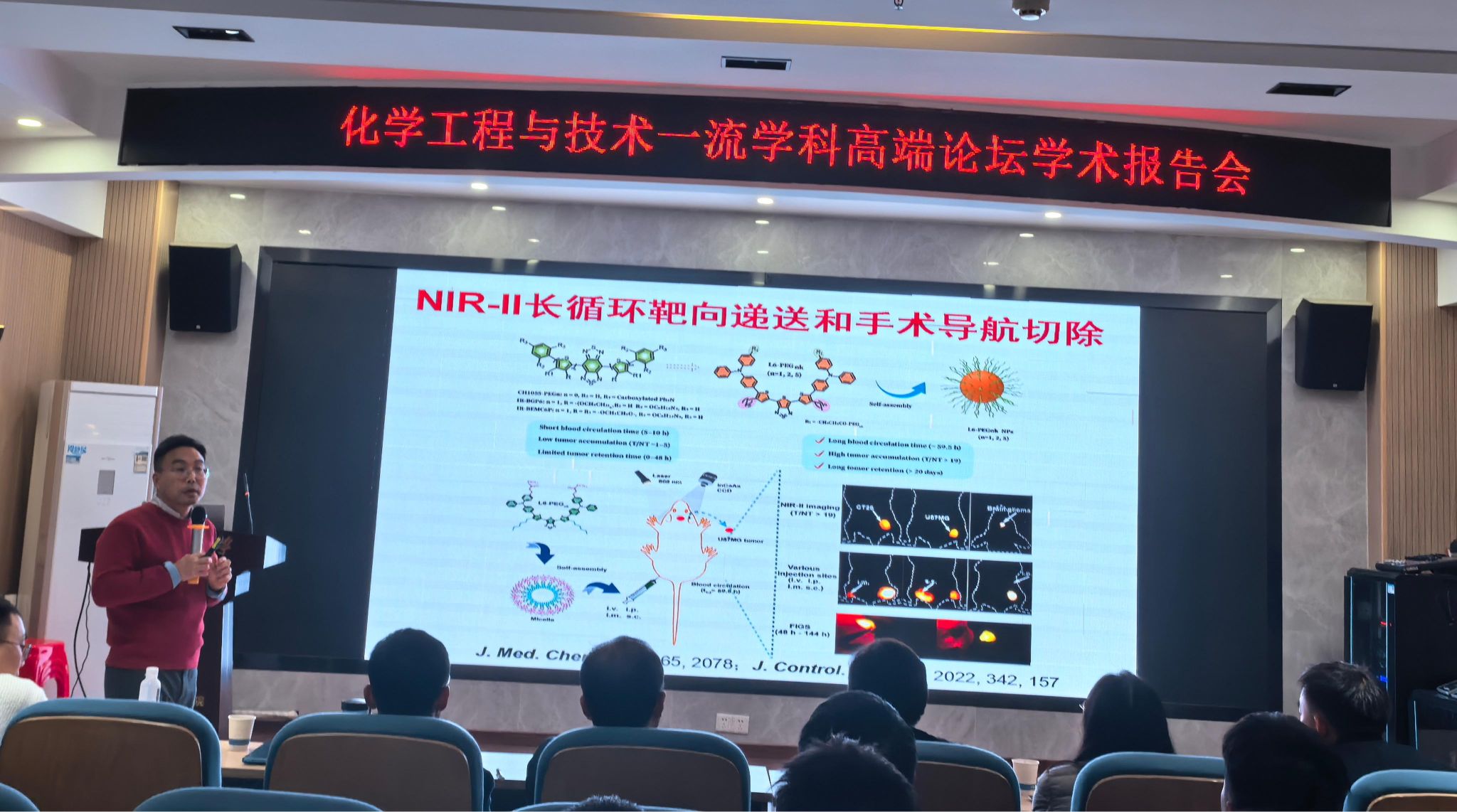 洪学传教授以《近红外二区荧光成像及光激活免疫治疗》为题,深入探讨了荧光成像技术在生物医学基础研究和疾病诊断治疗中的广泛应用。他着重介绍了二苯噻唑NIR-II和NIR-IIb小分子在活体成像中的潜在应用,系统阐述了近红外二区小分子活体成像的机制,通过具体的案例和实际应用,详细讲解了近红外二区小分子在体内可视化递送和光激活免疫治疗中的关键作用。