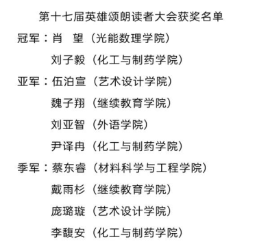 经过两轮的激烈角逐,共有10名同学脱颖而出,分别荣获一等奖、二等奖、三等奖。15名参赛选手获得优秀奖。他们或以真挚的赞美之情令人动容,或以纯熟的朗诵技巧让人折服,或以激昂的表演风格使人振奋。一位位英雄的形象通过他们的朗读变得更为立体、更加伟岸。此间山河,百代过客。月落参横,万古长青。12月12日,香蕉视频