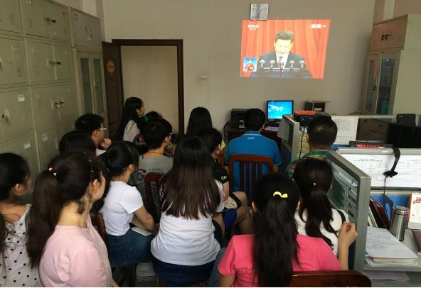 教师和各班级党员同志齐聚办公室,通过投影仪观看《庆祝中国共产党成立95周年大会》直播盛况。党员们仔细聆听习近平总书记的讲话,时而点头赞许,会后也表示要切实以党员标准要求自己,努力争当榜样。