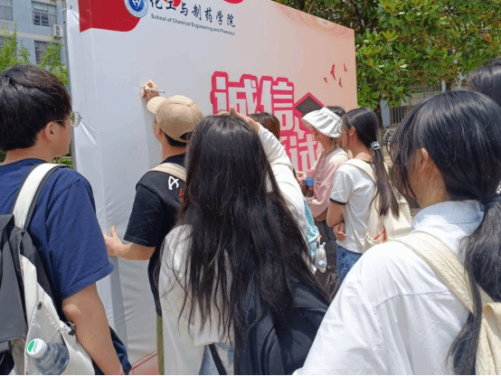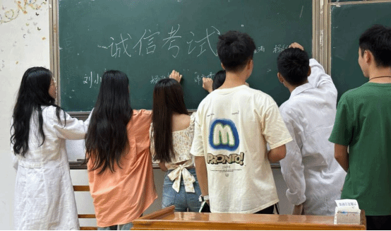 在教学楼前开展诚信考试签名活动,号召全体学生做遵规守纪、以德立身、明礼诚信的新时代大学生。
