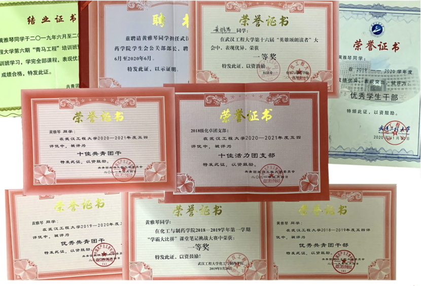 从大一起,黄雅琴连年获得“优秀学生干部”“优秀共青团干”等荣誉,2021年,十佳共青团干也收入囊中。一个人优秀不是真正的优秀,作为团支书,黄雅琴想的也从不是“一枝独秀”,而是带领班级同学一起进步,充分发挥主心骨的作用,以提升班团支部组织力、凝聚力为重点,组织开展特色鲜明主题班团会20余次,班级有10余人获得校级及以上荣誉,2018级化卓班团支部连续2年获得校“十佳活力团支部”荣誉;2021年5月,2018级化卓班团支部更是作为学校唯一代表湖北省参评全国1000强高校活力团支部,这是一个新的挑战。