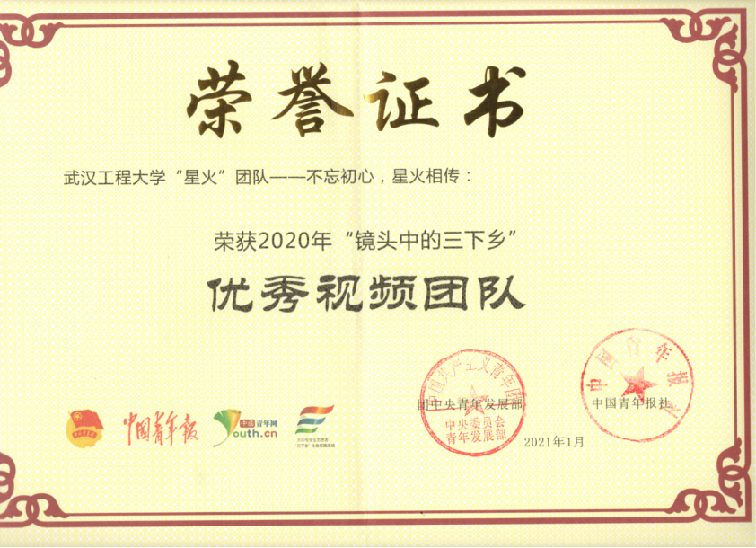 组建的“星火”团队。本次实践活动在疫情常态化防控下有序开展,团队积极探索创新“互联网+社会实践”新模式,以“不忘初心,‘星火’相传”为主题,采用线上云端方式,围绕疫情防控教育,采取“实习实训”方式展开,就基层党建工作、基层乡村建设、精准扶贫工作、疫情防控工作等方面进行社会实践活动。“星火”团队视频作品荣获2020年团中央“镜头中的三下乡”优秀视频奖。积极参加香蕉视频