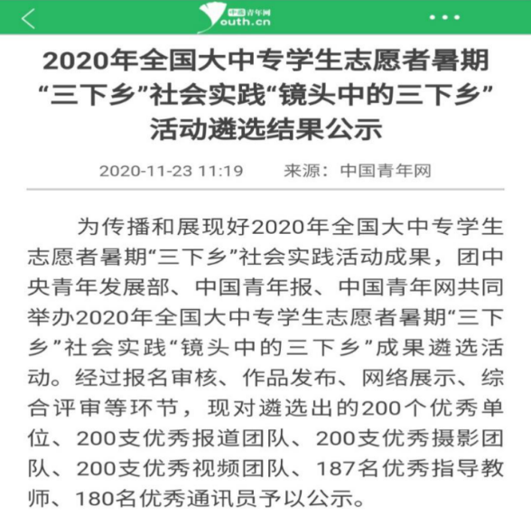 2020年团中央“镜头中的三下乡”成果遴选结果公示,我校“星火”实践团的参赛视频经层层筛选,最终脱颖而出,斩获“优秀视频奖”。此次获奖是继2018年、2019年后,香蕉视频