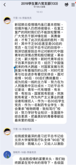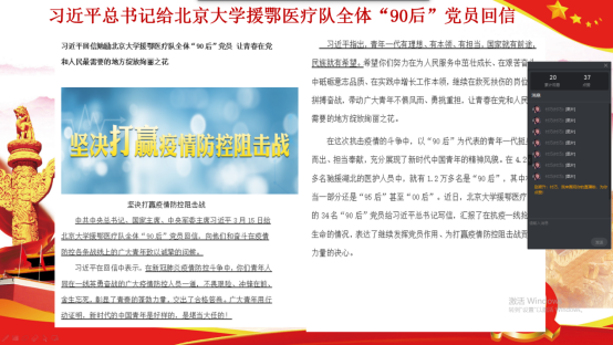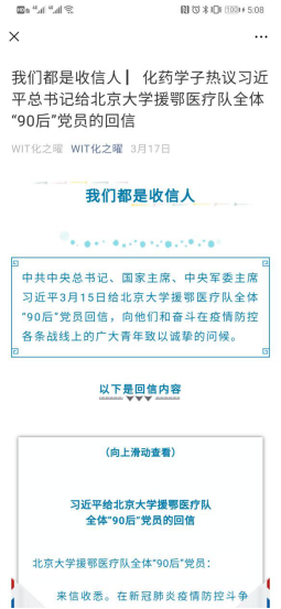 2020年3月15日,习近平总书记给北京大学援鄂医疗队全体“90后”党员回信,向他们和奋斗在疫情防控各条战线的广大青年致以最真挚的问候。一个月以来,化药学生党员深刻学习回信精神,各党支部围绕回信内容进行学习交流、分享心得,畅谈学习回信的体会、感悟和奋斗决心。