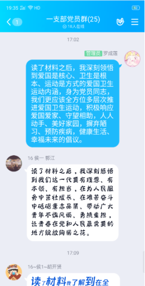 活动期间,各党支部丰富主题党日学习形式,组织支部党员集中观看爱国卫生运动相关视频、开展爱国卫生运动线上知识竞答活动,进一步了解爱国卫生运动的历史和重要意义。学生党员们积极表态,决心从自身做起,做好居家清洁卫生工作,保证良好饮食习惯、保持健康向上心态、坚持文明健康生活方式,将爱国卫生运动进行到底。