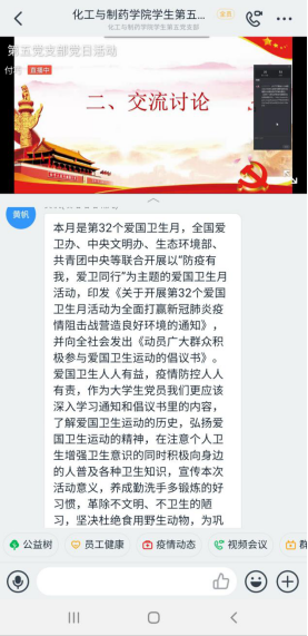 本科生党支部按照学习要求,组织党员自学《关于开展第32个爱国卫生月活动为全面打赢新冠肺炎疫情阻击战营造良好环境的通知》《动员广大群众积极参与爱国卫生运动的倡议书》,围绕“改善环境共享健康”、“向不卫生不文明的饮食陋习宣战”、“和谐心态快乐生活”等重点专题进行线上学习交流,分享对文明健康、绿色环保生活方式的感悟。
