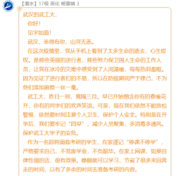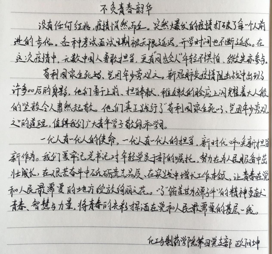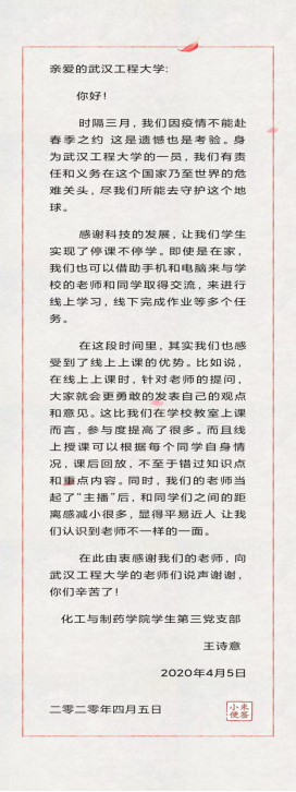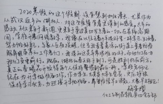 、同学的想念之情,并表示将继续做好防疫工作,在未接到返校通知时,坚持居家隔离、健康打卡、线上学习,积极配合学校的防控决策部署,争做防疫先锋,树好党员这面伟大旗帜。