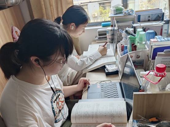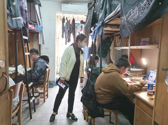 领导、辅导员和团委骨干组成督察小组,定期分批走访学生宿舍,查看学生上网课情况,深入了解疫情防控期间学生的学习生活与身心健康。走访过程中,同学们能够克服实际困难,聚精会神地坐在电脑前进行网课学习,跟着老师的节奏认真记录笔记。