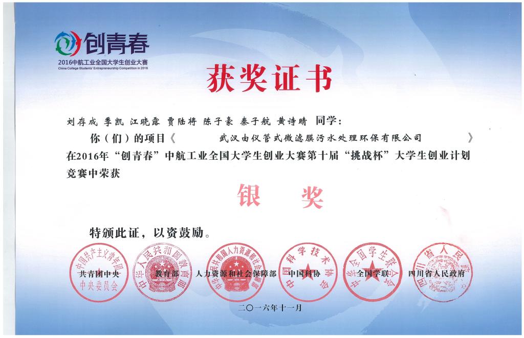 研究生刘存成负责的计划创业项目《武汉由仪管式微滤膜污水处理环保有限公司》经过激烈的角逐,成功斩获全国银奖。