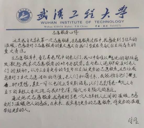一天的志愿服务结束后,瑞康养老护理中心院长亲自面见付佶同学,并夸赞他是自己所见过最勤劳能干的学生,也希望以后能有更多的青年人重视老人并投入关心关爱老人的工作中。