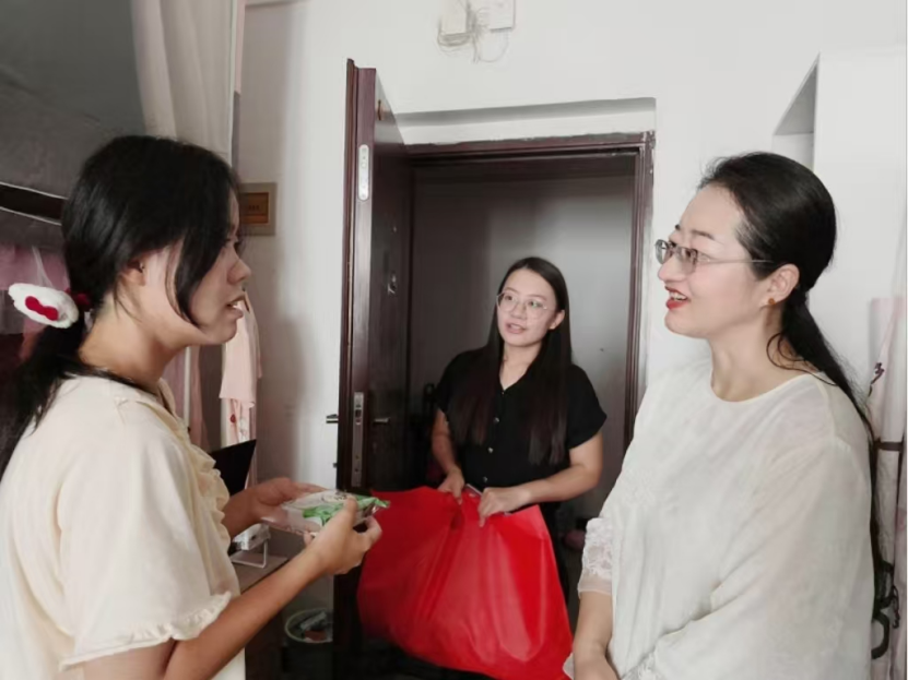 党委副书记周丹与辅导员刘悦薇、张列罡、文静一同走访中秋活动现场,深入学生宿舍,看望慰问假期留校学生,为同学们送上月饼,并致以节日的诚挚问候。