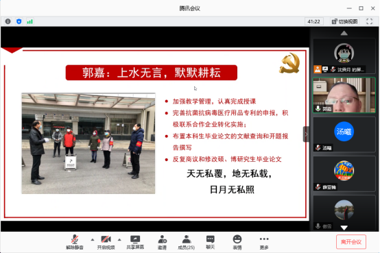抗疫志愿者代表郭嘉、龙秉文、李雁博分别以“上水无言,默默耕耘”“抗疫有我,让党旗高高飘扬”“我是党员,我在家门口防控疫情”为主题,向党员教师分享了自己疫情期间为工大社区捐献物资、分发蔬菜、协助管控的故事。科研二支部书记龙秉文表示,作为党员,必须在关键时刻挺身而出,起表率作用,在疫情面前,不畏艰难,贡献自己的一份力量。虽然疫情已经得到了基本控制,但是依然不能放松要求,坚持教学、防疫两手抓,将香蕉视频