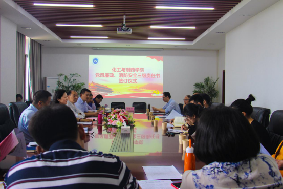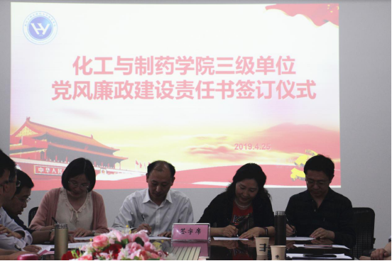 党委书记王雪梅、院长喻发全与三级单位代表化学工程系主任闫志国、化工第二支部书记余响林签订党风廉政建设责任书。