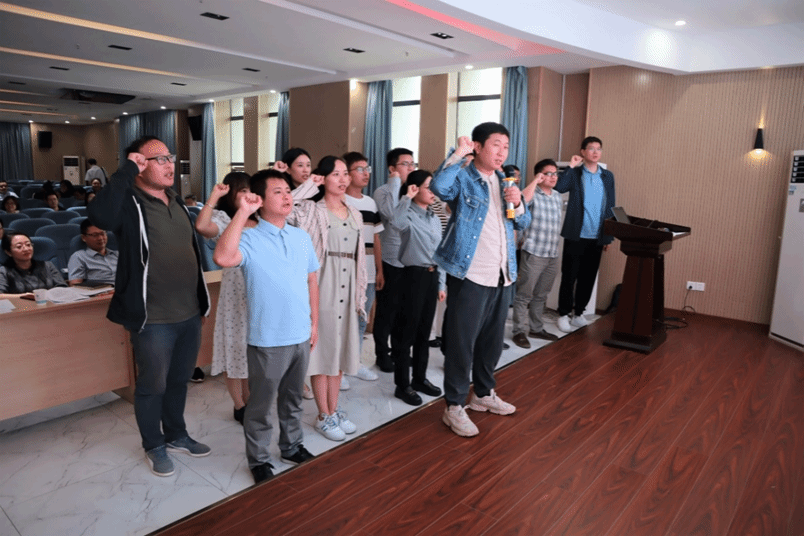 新进教师代表刘存成领誓,带领全体新入职教职工进行入职宣誓,全体教师在铿锵的誓词中进一步增强教师教书育人的责任感、使命感和荣誉感。