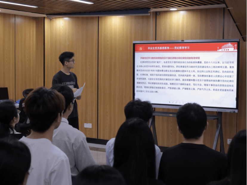 何振对新修订的《中国共产党纪律处分条例》进行了重点导学。他指出开展党纪学习教育是加强党的纪律建设,推动全面从严治党向纵深发展的重要举措,全体党员同志要不断强化自我约束,规范言行举止,切实将《条例》的各项规定贯彻落实到学习生活当中,坚持“严”的主基调不动摇,绷紧纪律规矩这根弦,把党的纪律印刻在心上,落实在行动中,永葆共产党人政治本色。