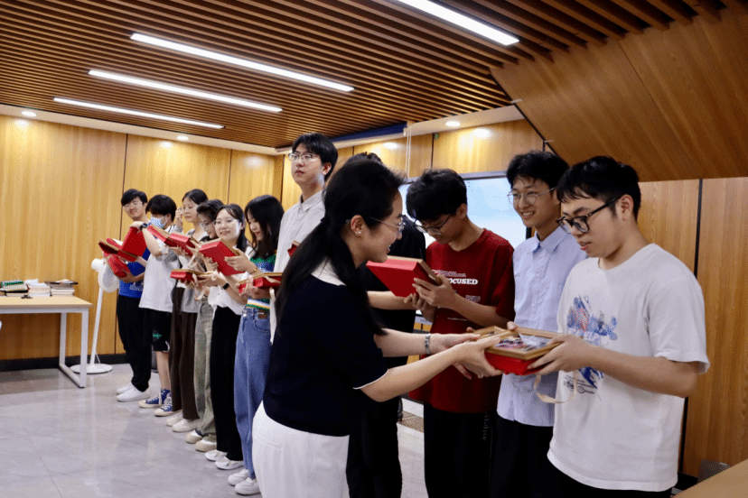 党支部书记周丹向毕业生党员赠送毕业纪念礼品,一本印有支部logo和支部书记亲笔写下祝福语的笔记本以及一张支部“全家福”,承载着支部对毕业生党员的深深祝福。
