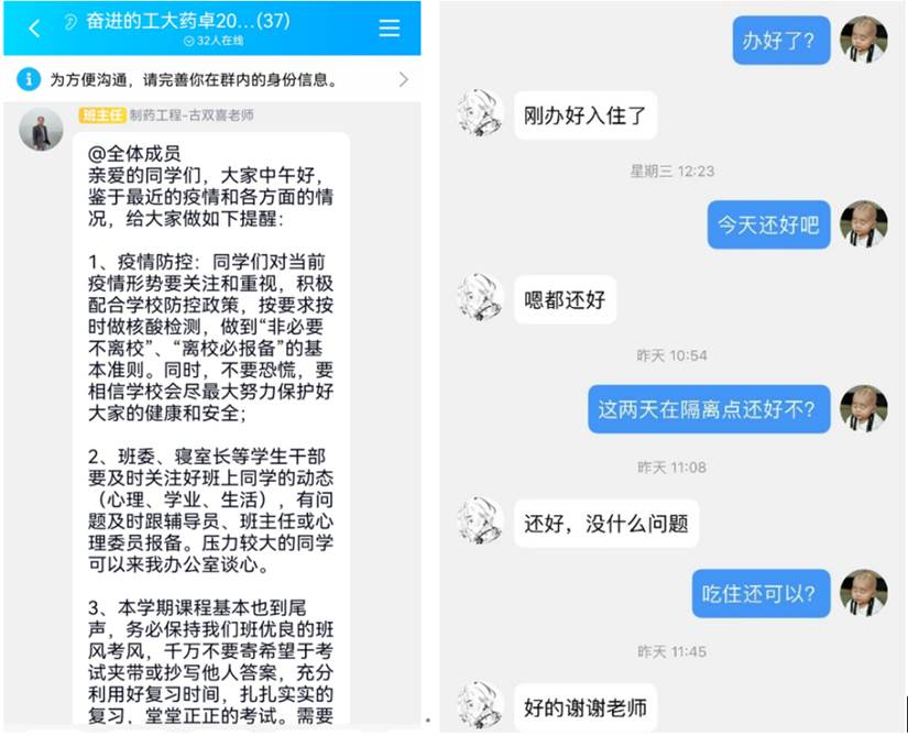 辅导员和班主任及时传达每一条防疫信息,确保每一条重要消息通知到位,日复一日督促健康打卡,提醒大家完成核酸检测,给大家暖心小贴士,关心隔离学生情况,认真落实每位同学的健康状况。