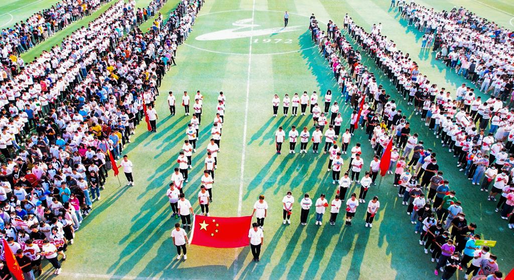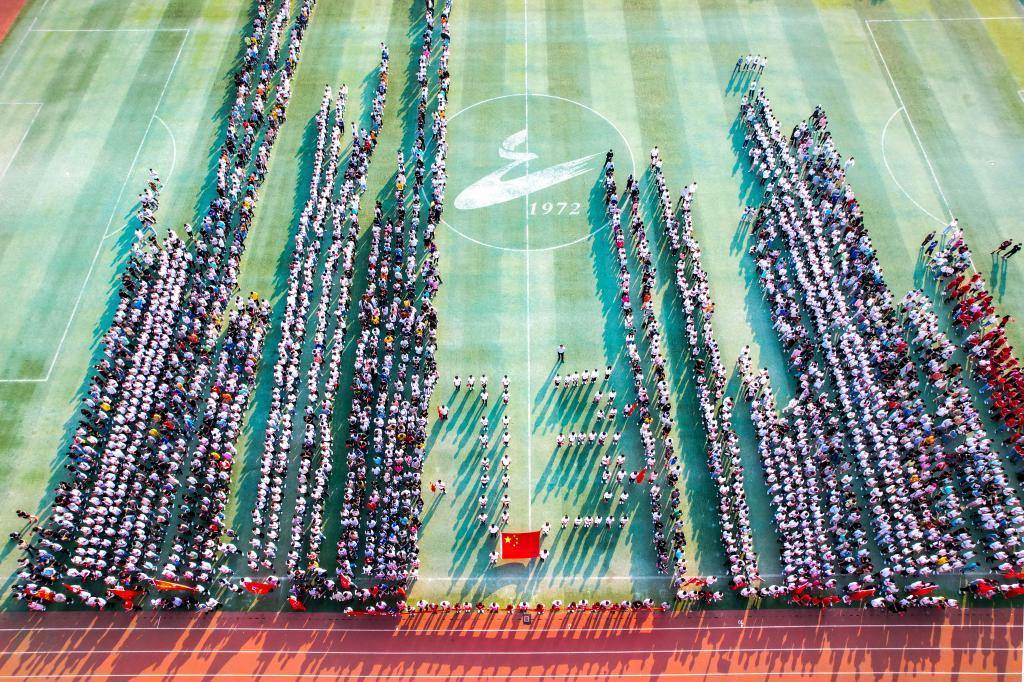 新生代表73人排列成了一个巨大的“73”,挥舞着鲜艳的五星红旗,象征祖国历经73载,愈发繁荣富强。