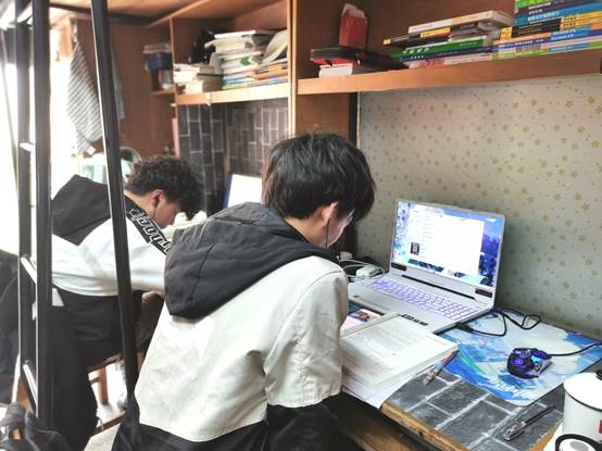 领导、辅导员和团委骨干组成督察小组,定期分批走访学生宿舍,查看学生上网课情况,深入了解疫情防控期间学生的学习生活与身心健康。走访过程中,同学们能够克服实际困难,聚精会神地坐在电脑前进行网课学习,跟着老师的节奏认真记录笔记。