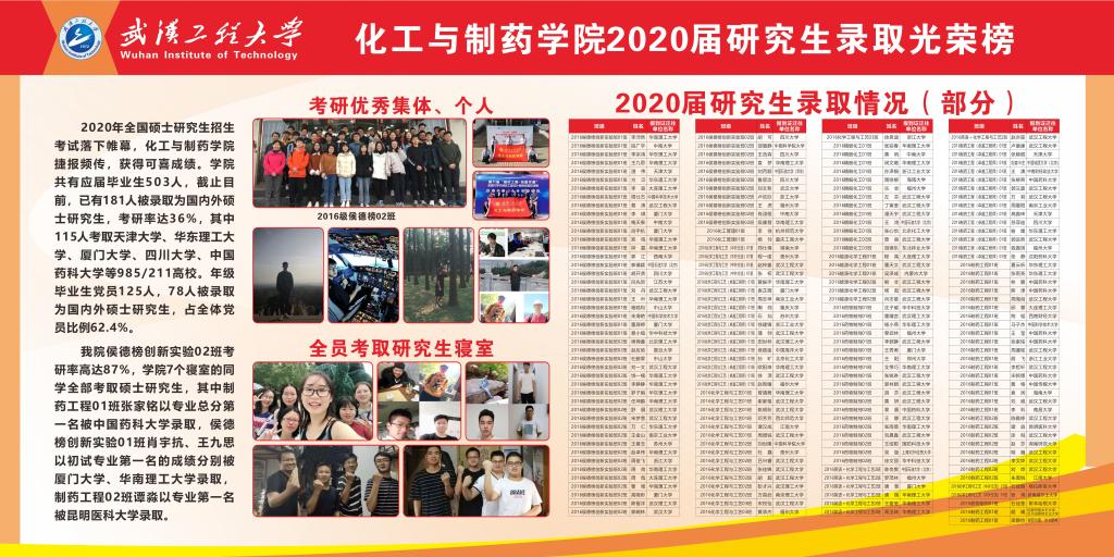 2020届毕业生考研中有181人被录取为国内外硕士研究生,其中115人被天津大学、华东理工大学、华南理工大学、厦门大学、浙江大学、复旦大学、中科院大学、四川大学、中国药科大学等双一流高校录取,其中侯德榜创新实验2班考研率达87%,香蕉视频