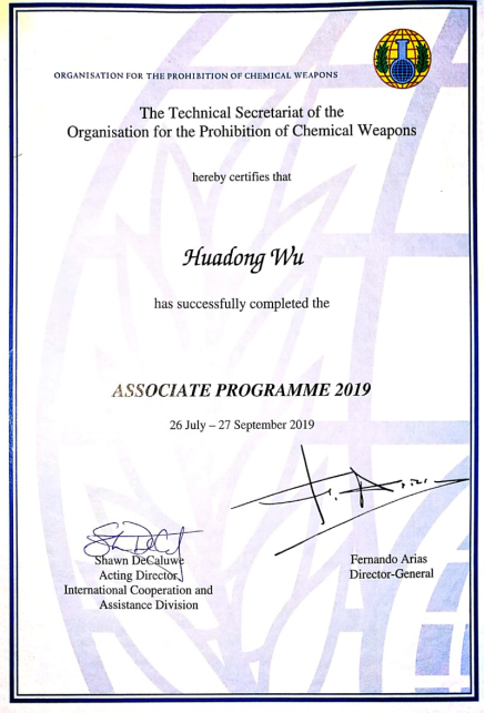 教师吴华东博士,经学校同意,省经济与信息化厅推荐, 国家工业与信息化部和外交部申报,通过联合国国际禁止化学武器组织(Organization for the Prohibition of Chemical Weapons, OPCW)电话测试,获批了合作培训(Associate Programme)项目。该培训包括在海牙OPCW总部的参观和讲座、在英国萨里大学的理论课程、在卡塔尔化工厂的实训等。培训学员来自32个国家和地区的工业界、学校科研单位和政府机构,吴华东博士是我国选派的唯一代表。