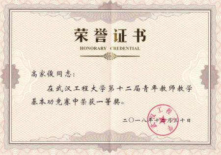 老师的一致认可。2017年高家俊全校评教位列前100名;2018年,荣获学校青年教师教学基本功竞赛一等奖,获批国家自然科学基金青年基金项目1项、湖北省教育厅科研计划项目1项,指导本科生获批校长基金项目1项,且以第一作者身份,在化工领域Top期刊Fuel上发表论文1篇,申请发明专利5项;2019年,高家俊获得香蕉视频
