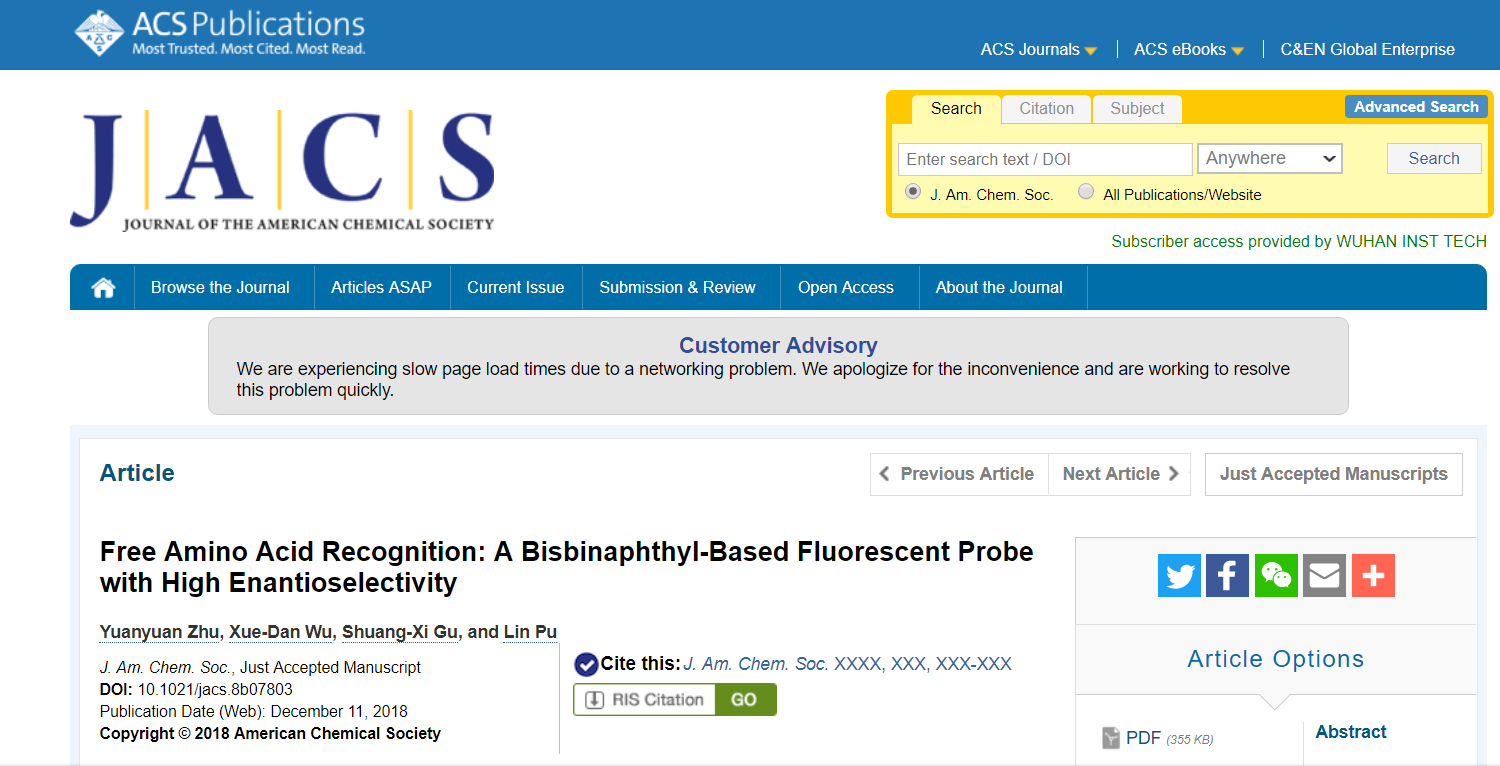 朱园园博士分别以通讯作者和第一作者身份与美国弗吉尼亚大学Lin Pu教授(通讯作者)合作在化学领域顶尖期刊Journal of the American Chemical Society(简称JACS)上发表标题为“Free Amino Acid Recognition:A Bisbinaphthyl-Based Fluorescent Probe with High Enantioselectivity”的高水平研究论文。(论文链接:)