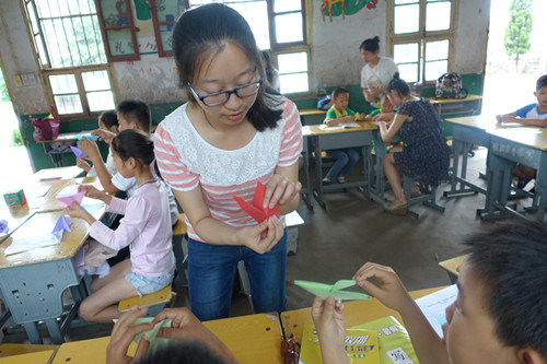 7月16日,社会实践团成员到咸安区东门村“希望家园”,开展了关爱留守儿童活动。社会实践团成员与留守儿童做游戏,教他们剪纸、画画、唱歌,送去了文具,受到了留守儿童的欢迎。