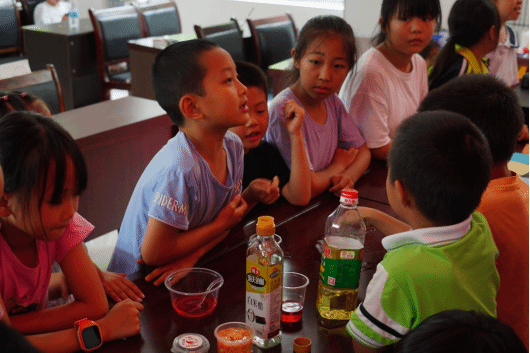 化学实验小课堂上,实践团成员给孩子们演示了酸性、碱性溶液的识别方法,并对小朋友们生活中常见的溶液进行了演示。同时从基础用品出发,和小朋友们一起完成日常小实验。