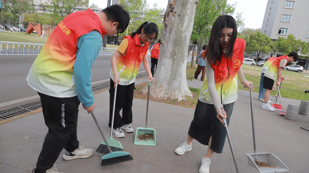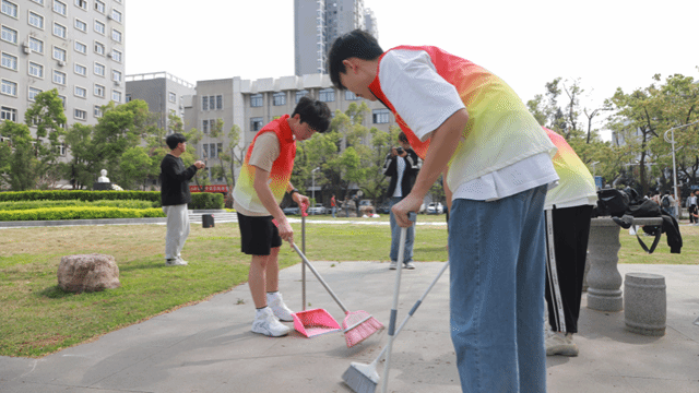 服务团队共同开展许志伟广场的垃圾清扫劳动实践教育。