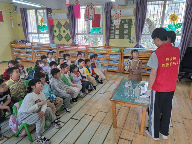 仪式结束后,许志伟志愿服务队与工大幼儿园结对开展“大手拉小手”活动,为孩子们带来趣味化学小实验,激发班级小朋友对化学化工的兴趣,提高孩子们的创造力。