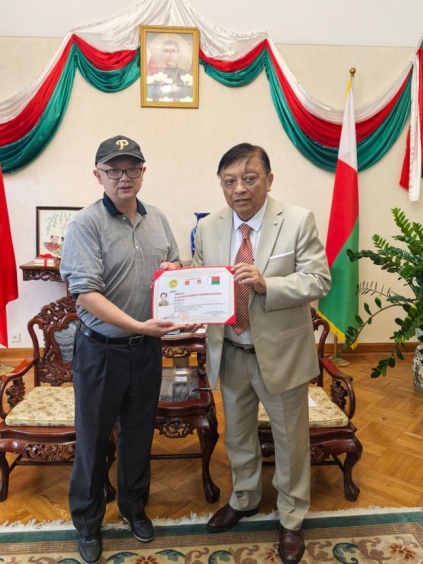 周霁老师在北京受聘为马达加斯加共和国驻华大使馆特聘安全教育顾问。马达加斯加共和国驻华大使让•路易•罗宾逊先生接见了周霁,并为其颁发了聘书。