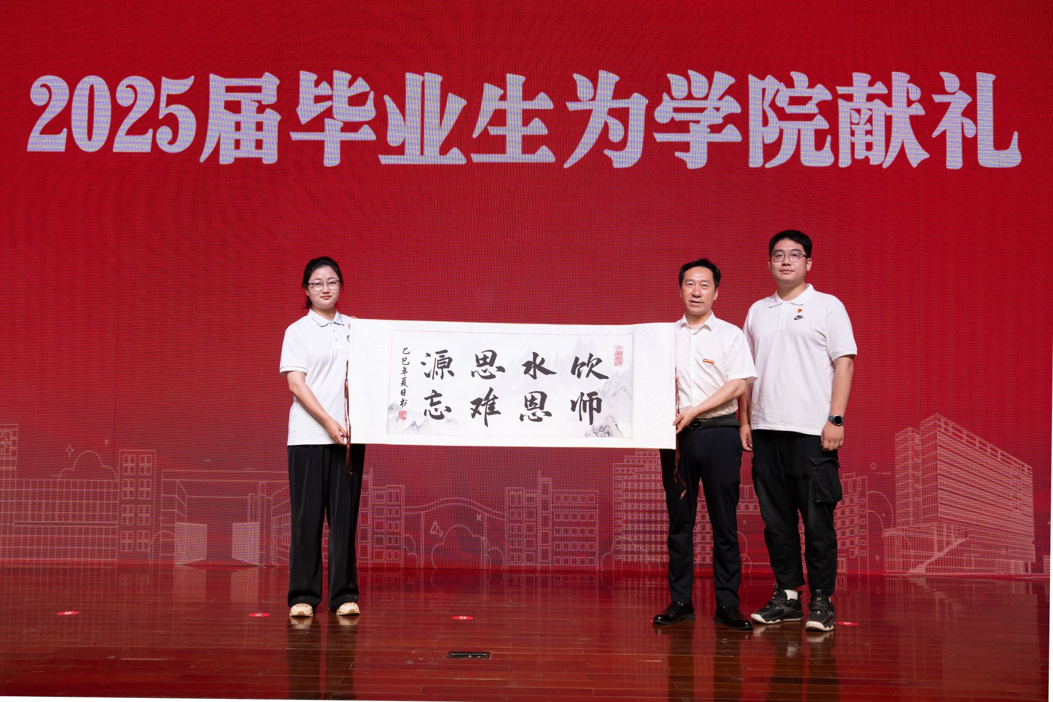 毕业生代表向香蕉视频 敬赠精心准备的毕业纪念品,表达对香蕉视频 的感恩之情,院党委书记杨海波代表香蕉视频 郑重接受了这份心意。“饮水思源,师恩难忘”,一笔一划勾勒出毕业学子对香蕉视频 的深情。