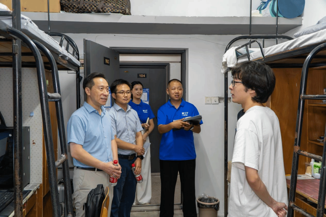 领导来到男生宿舍,详细了解新生生源背景、认真核实每位同学的班级信息,叮嘱同学们要尽快完成从中学到大学的角色转变,学会独立自主,做好学业规划;要珍惜同窗缘分,互相关心、互相帮助;要提高安全意识,注意人身与财产等安全。并鼓励同学们:大学是探索未知、追求真理的新起点,希望同学们能珍惜时光,勤奋学习,勇于实践,在工大这片沃土上茁壮成长,书写属于自己的精彩青春篇章。
