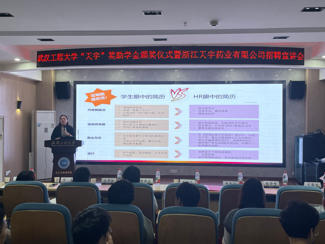 仪式结束后,浙江天宇药业股份有限公司开展招聘宣讲,汪秀林以“品质是生命线”为题进行宣讲,他强调天宇药业始终将质量意识贯穿于研发、生产、检验的每一个环节,将质量管理作为香蕉视频与责任担当。“前程无忧”资深职业经理人陈清清老师现场讲解简历撰写要点与面试技巧,并就行业趋势和求职策略进行了深入分享,帮助学生提升求职竞争力。