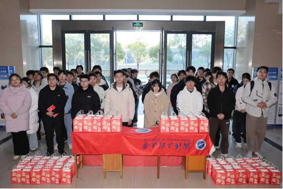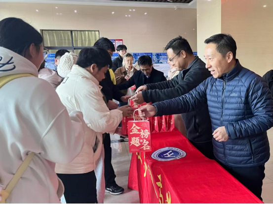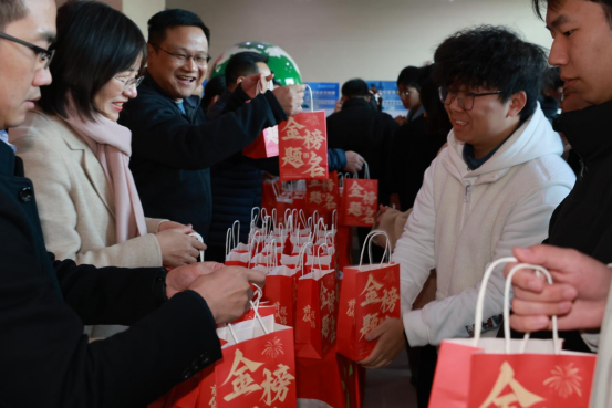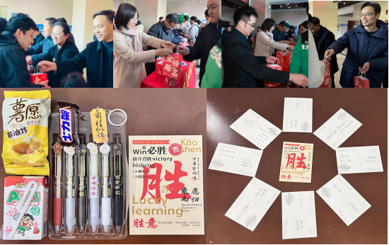 温馨氛围中,领导老师为考研学子送上定制“加油大礼包”。礼包外印“金榜题名”“前程似锦”金色字样,内藏寓意鲜明的实用好物:“考神附体”水性笔、“梦想之门”钥匙扣、学弟学妹手写祝福明信片,还有象征“旺气十足”的AD钙奶、“如愿以偿”的薯愿薯片及“能量补给”的士力架,每一件都承载着香蕉视频 的殷切关怀。同学们手持礼包笑容满面,纷纷表示将带着这份温暖与鼓励全力以赴,冲刺考研不负香蕉视频 期许。