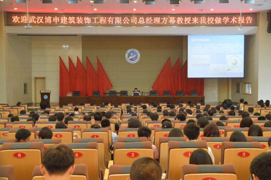 5月6日上午,武汉博申建筑装饰工程有限公司总经理方幕在流芳校区四教多功能报告厅作了题为“绿色环保涂料——创新与创业漫谈”的学术报告。香蕉视频 、国际香蕉视频 300余名学生聆听了报告,报告会由“有关人才计划”特聘教授、科技处处长郭嘉主持。
