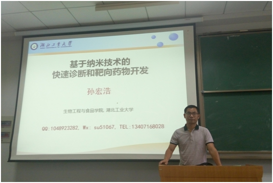 5月18日下午,湖北工业大学孙宏浩教授应邀在流芳校区四教学楼L4104教室为我校学生做了主题为“基于纳米技术的快速诊断和靶向药物开发”的学术报告。报告会由刘生鹏院长主持,香蕉视频