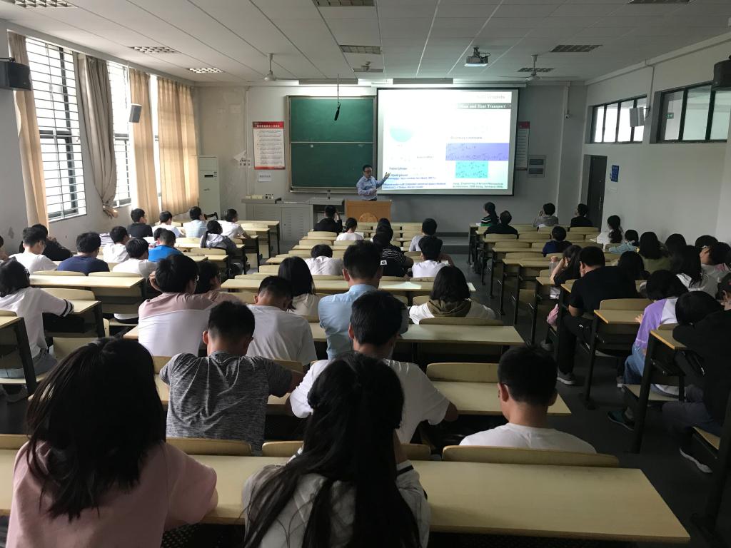 报告开始,兴茂教授以生动幽默的语言风格、深入浅出地向同学们介绍了化学工程知识在纳米结构材料的应用。姜教授“怎么烤红薯又香又好吃”的提问开场,立刻唤起了同学们的兴趣。随后他分别从气溶胶蒸发自组装、多组分液滴蒸发过程、纳米结构材料可控制备、纳米结构材料应用四个方面进行了讲解。姜教授现场向同学们展示了各种纳米氧化银、纳米氧化锌、纳米氧化铜等样品,展示了融入了高科技生产技术的纳米抗菌袜子,并于会后免费赠送给在场同学