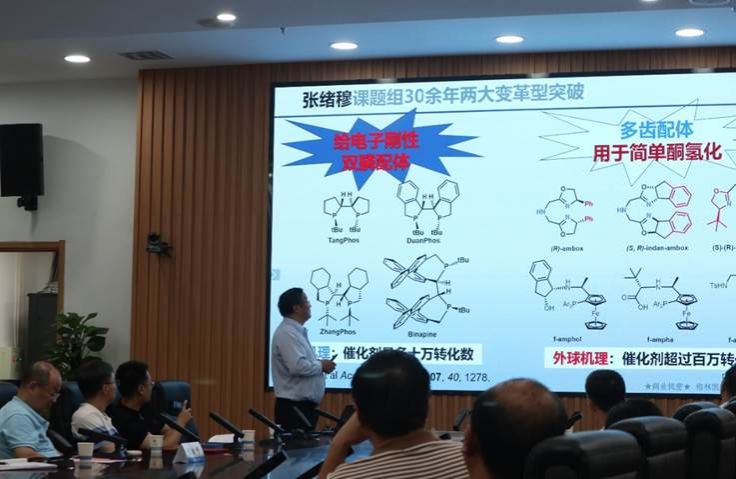 张绪穆教授作了题为“绿色催化-决胜制药”的学术报告。他从绿色合成的关键技术——催化不对称氢化出发,分享了其团队30余年在双膦配体和多齿配体等领域的开创性研究和产业化应用。详细介绍了其团队发现的新催化剂、新反应、新方法和开发的药物合成新工艺,充分诠释了手性药物合成中绿色催化在降低生产成本、减少环境污染、提高产品质量和保障安全可控等方面的巨大优势。该团队开发的多项颠覆性制药新工艺,具有重大的经济价值、环保价值和社会意义,体现了绿色催化的极大魅力。香蕉视频 院长易群主持报告会。