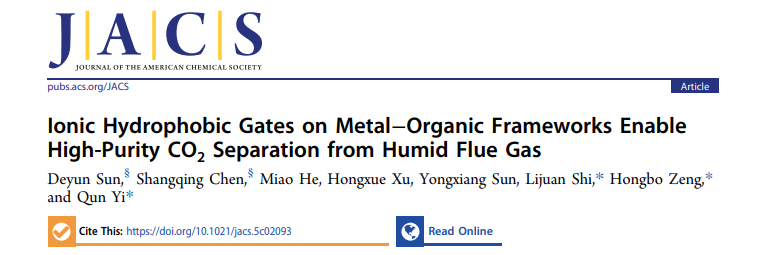 该研究通过在金属有机框架材料(MOFs)表面组装疏水性离子液体和富氟对苯二甲醛,构建了兼具H2O渗透屏障和CO2选择性传输通道的双功能壳层,同时保持MOFs内核的晶体结构和孔道完整性。在模拟工业烟道气的吸附分离测试中,该材料表现出卓越性能:CO2/N2选择性高达1780(15/85,v/v),可从高湿烟气(RH=80%)中直接获取纯度99.999%的CO2。该设计巧妙解决了吸附材料“疏水性”与“CO2选择性”难以兼得的行业痛点,实现了从高湿度烟道气中一步分离超高纯度CO2的突破性进展。此外,该策略展现出良好的通用性与循环稳定性,为潮湿工况下的低能耗、高效率碳捕集提供了新思路。